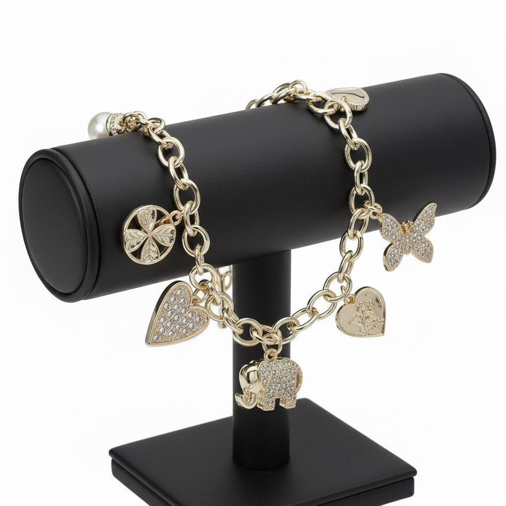 14K Gold Plated CZ Stone Paved Elephant Heart Butterfly Heart Clover Pearl Charm Station Bracelet