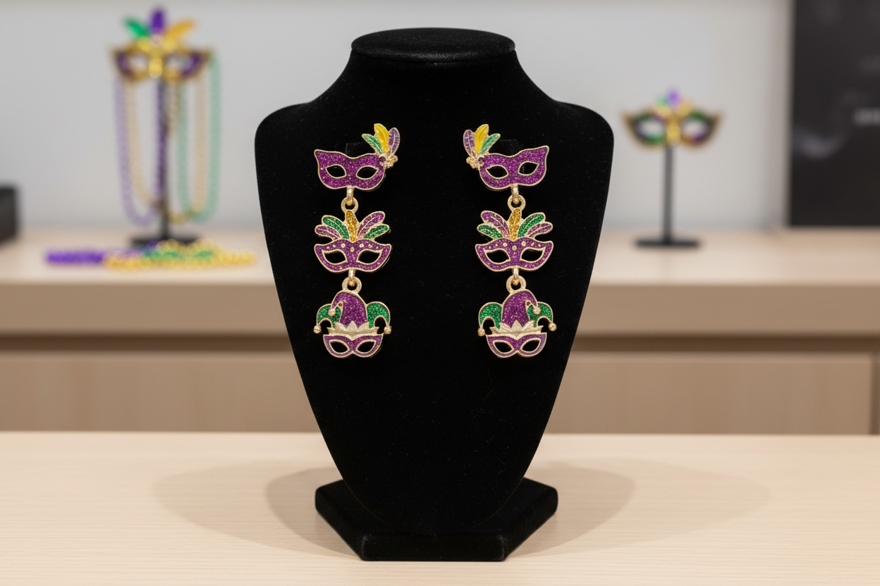 Celebrate in dazzling style with these Mardi Gras mask drop earrings featuring a trio of glittering designs and vibrant detailing. Perfect for parades, parties, or themed events, they embody the joy and energy of carnival season with bold sparkle and festive flair.