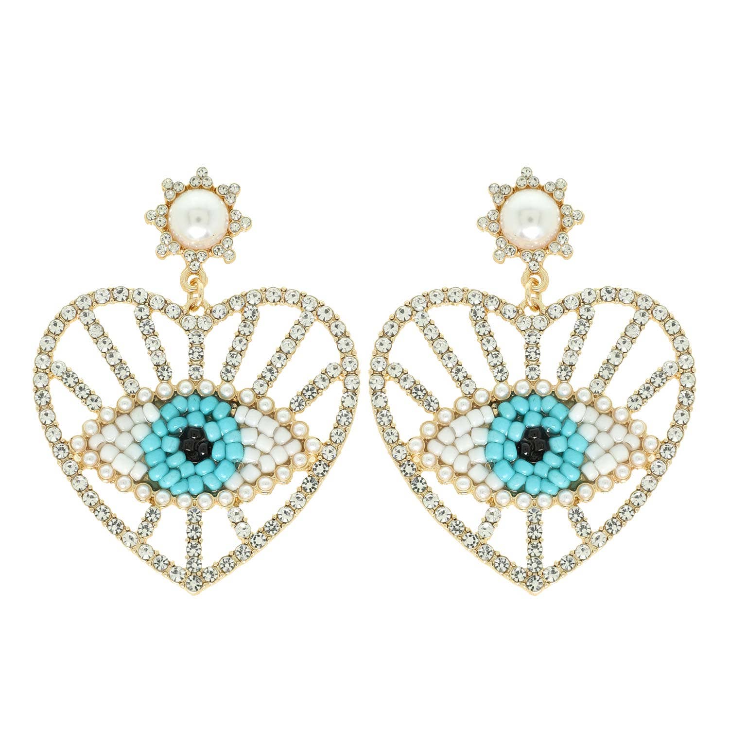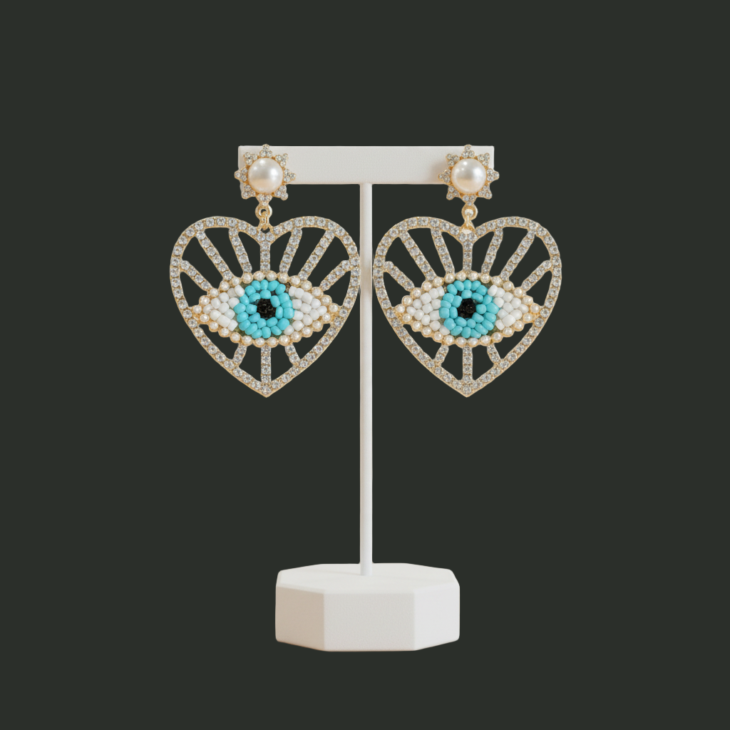 Evil Eye Heart Beaded Statement Earrings – Protective Boho Dangle Jewelry